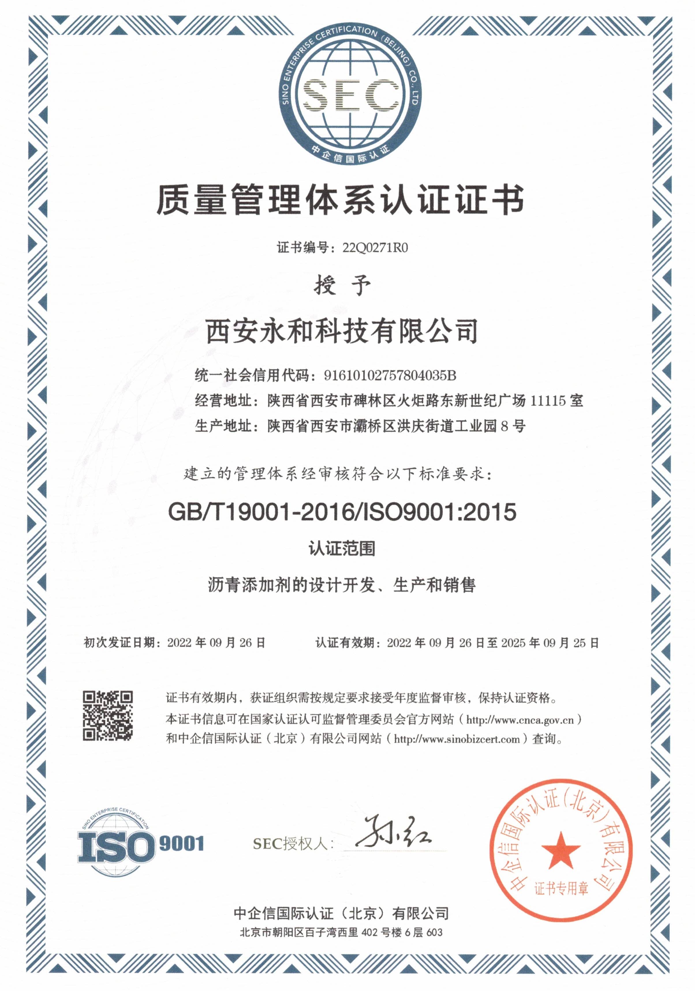 熱烈祝賀“西安永和科技有限公司”榮獲質量管理體系榮譽